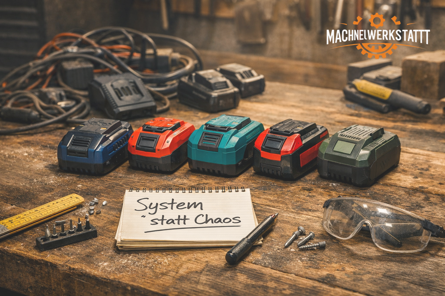 Und genau da passieren die klassischen Fehler: Viele kaufen heute einen Akkuschrauber, morgen eine Säge in einem anderen System – und wundern sich später über die „Ladegeräte-Sammlung des Grauens“. System-Hopping ist Geldverbrennung.